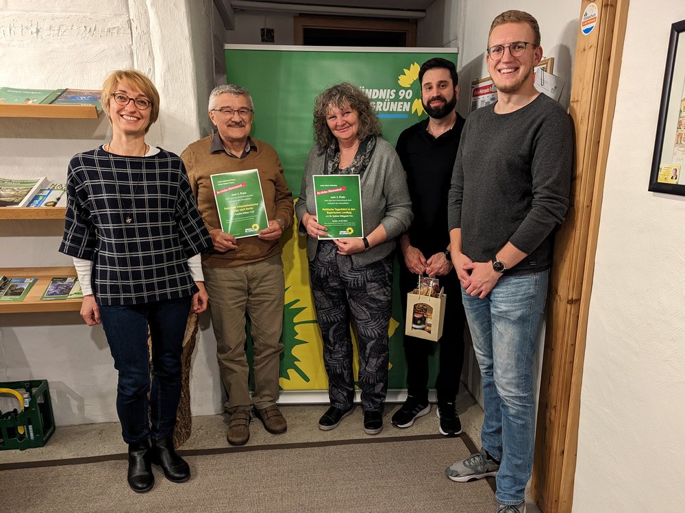 In Anwesenheit des gesamten Kreisvorstands von Bündnis 90/Die Grünen wurde den Gewinner*innen ihre Preise überreicht. Das Sprecher*innen-Duo aus Tanja Josche und Henrik Schmidt-Heck gratulierte herzlich und wünschte bereichernde Erlebnisse bei den politischen Fahrten und leckere Genussmomente.