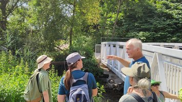Einer von ihnen ist Gerhard Bauer aus Büchenbach, der der Gruppe anschaulich das Zusammenspiel von Wehren und Gräben erklärt und auch aktuelle Herausforderungen anspricht. So wird es immer schwieriger, genug Mitstreiter zu finden, die die Anlagen pflegen und bedienen. Zudem bereiten Baumaßnahmen wie die Erweiterung der Kläranlage Roth dem Verband Sorgen: Auch wenn diese nicht direkt auf den Wässerwiesen entsteht, so könnten sie doch Auswirkungen auf das komplexe System haben. Er appelliert daher an die Stadt, auch für Ausgleichsmaßnahmen nicht auf diese Flächen zurückzugreifen. „Die UNESCO hat die traditionelle Wiesenbewässerung 2023 zum immateriellen Kulturerbe der Menschheit erklärt. Damit setzt sie ein klares Zeichen zum Schutz dieser Technik,“ bekräftigt auch Jörg Henninger.