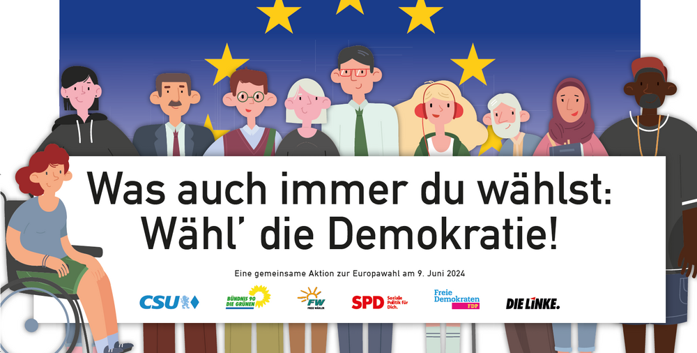 „Was auch immer du wählst: Wähl die Demokratie!“ Mit diesem Slogan werden in Kürze in allen Gemeinden des Landkreises Roth Großplakate die Bürgerinnen und Bürger dazu aufrufen, bei der Europawahl am 9. Juni ihre Stimme abzugeben. Das Besondere daran: Es handelt sich um einen gemeinsamen Wahlaufruf von CSU, BÜNDNIS 90 / DIE GRÜNEN, SPD, Freie Wähler, FDP, und DIE LINKE. Ein solcher Zusammenschluss über das gesamte Parteienspektrum hinweg ist ein Novum für den Landkreis und sendet eine starke Botschaft: So sehr sich diese sieben Parteien in ihren Positionen und Parteiprogrammen auch unterscheiden mögen, es eint sie das klare Bekenntnis zur Europäischen Union und zur Demokratie.