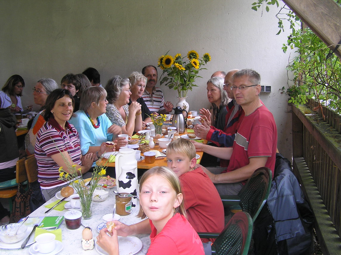 Bei einem fröhlichen Frühstück mit gesunden Produkten aus der Region rüsteten sich die Grünen aus Schwabach und Roth samt Familien und Freunden am Sonntag für den bevorstehenden Wahlkampf. Mit köstlichen Marmeladen, Eiern, Wurst und Käse aus eigener Herstellung bewirtete Familie Winkler auf ihrem Hof in Meckenlohe die rund 30köpfige Schar. Während des Milchlieferstreiks Anfang Juni hatten die Grünen den Landwirt, Mitglied im BDM, schon einmal besucht, um sich aus erster Hand über die Problematik zu informieren. Nun wollten sie erfahren, ob sich der Streik für die Milcherzeuger gelohnt hätte. Wie Dieter Winkler erläuterte, könne von einem Erfolg nur sehr bedingt gesprochen werden. Zwar seien im Juni 2-3 Cent pro Liter Milch mehr bezahlt worden, doch lägen die eigentlichen Ziele - Verringerung der Milchmenge auf dem Markt, Anpassung des Preises an die Nachfrage - nach wie vor in weiter Ferne.Grüne Listenkandidatin Renate Grädler erinnerte daran, dass sich der CSU-Landwirtschafts- und Verbraucherschutzminister Horst Seehofer während des Streiks dafür einsetzte, der Ukraine als neuem WTO-Mitglied zügig Milch- und Fleischexporte in die EU zu ermöglichen. „Wie sollen aber die Milchbauern hier ihre mühsam erkämpften fairen Preise einfordern können, wenn gleichzeitig billige Milchimporte das Überangebot auf dem Markt weiter anheizen?“ müsse man sich fragen. Dass es eine staatliche Subventionierung für den Neubau von Ställen gebe, sei auch nicht gerade eine Weichenstellung in die richtige Richtung, ergänzte Gastgeber Winkler.Wie sehen die Vorstellungen der Grünen zu diesem Thema aus? Die Direktkandidatinnen Karin Holluba-Rau (Bezirkstag) sowie Renate Krilles und Dr. Ursula Burkhardt (Landtag), allesamt keine Landwirtschaftsexpertinnen, trugen die Forderungen der Grünen Landtagsfraktion zur Milchwirtschaft vor und ließen sie sich vom Fachmann erklären. Winkler bestätigte, dass sowohl die Streichung der Bundessaldierung als auch die Erhöhung des Faktors für die Umrechnung von Milch-Liter in Kilogramm um 0,01 Punkt der Verringerung der Milchmenge dienen würden und daher sehr sinnvolle Maßnahmen wären. „Das dürft ihr ruhig fordern“, meinte Winkler verschmitzt.Solcherart ermuntert und gestärkt machten sich die Kandidatinnen und ihre Mitstreiter wieder auf den Weg. „Zeit wird’s“ - so das Motto der Grünen - für eine nachhaltige Politik, deren Ziel auf allen Ebenen die Bewahrung von Mensch, Menschenwürde und Natur sei.