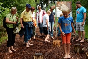 In diesem Rahmen luden die Grünen im Landkreis Roth zu einem Spaziergang auf dem Barfuß-Wonnen-Wanderweg in Spalt-Enderndorf ein. Der Barfußpfad führt 2,5 km lang bergab, bergauf durch den Wald, auf Schwellen, Kieselsteinen, Glasscherben, Tannenzapfen, durch Wasser und Schlamm - viel zum Fühlen für die Füße, und Tastkästen für die Hände gibt es auch.