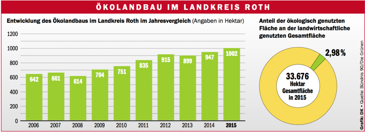 Noch schlechter sieht es im Landkreis Roth aus. Der Ökolandbau liegt hier im Jahr 2015 bei 1002 Hektar, was einem Anteil an der landwirtschaftlichen Nutzfläche von knapp drei Prozent entspricht. Dies hat eine schriftliche Anfrage des Grünen Landtagsabgeordneten Markus Ganserer an die bayerische Staatsregierung ergeben.