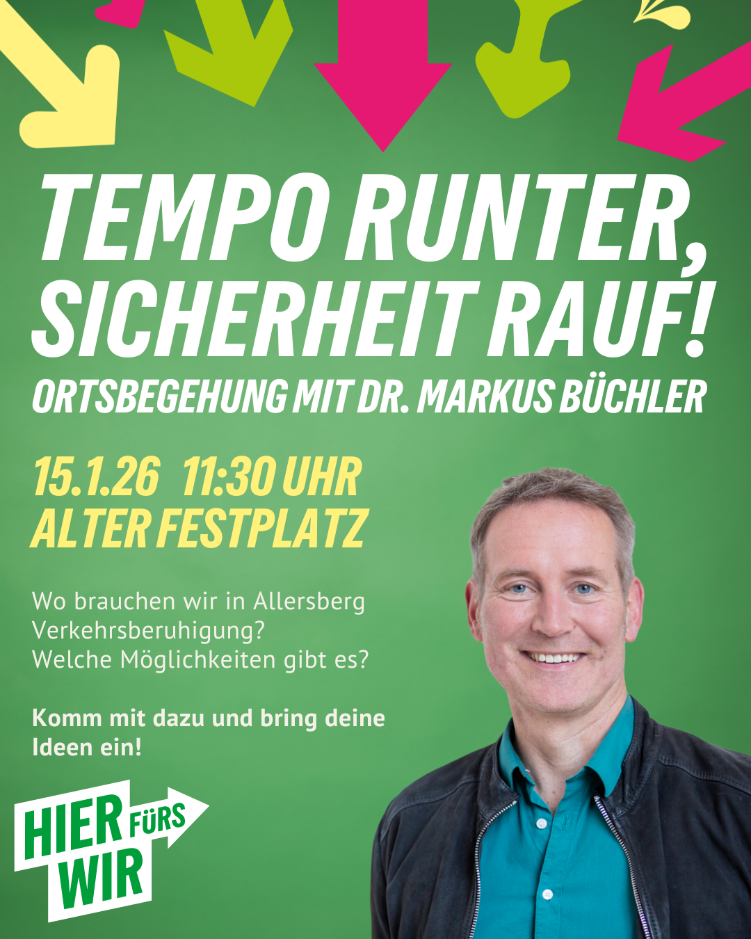 Tempo 30 am Marktplatz? Ein Zebrastreifen an der Apotheke? Wir gehen gemeinsam durch Allersberg und besprechen, was geht! Mit dabei ist Dr. Markus Büchler, verkehrspolitischer Sprecher der Landtags-Grünen.