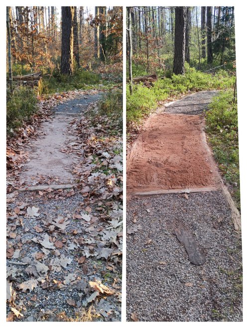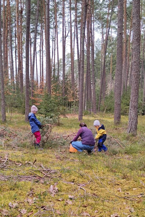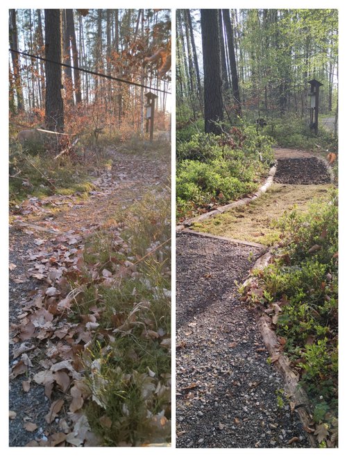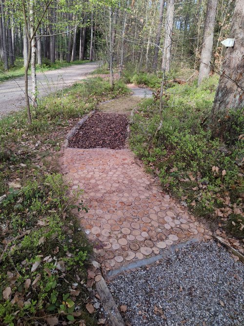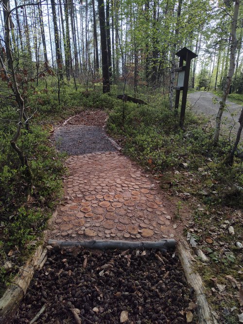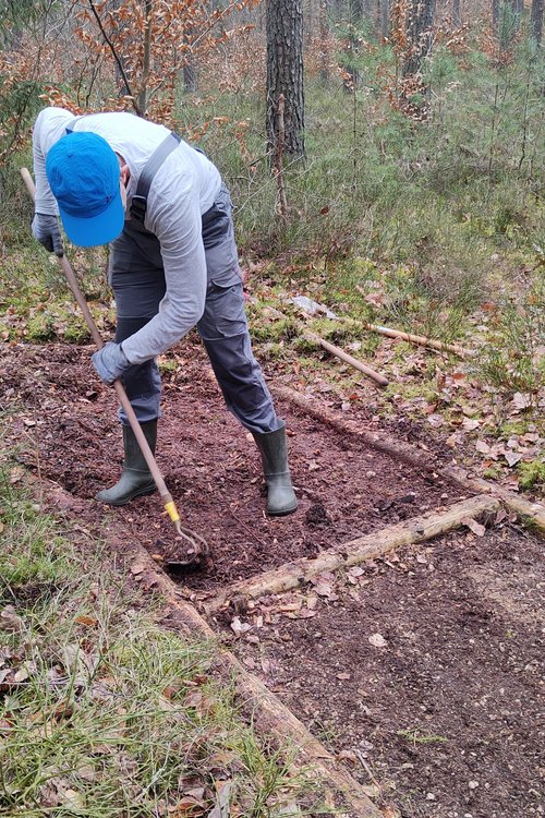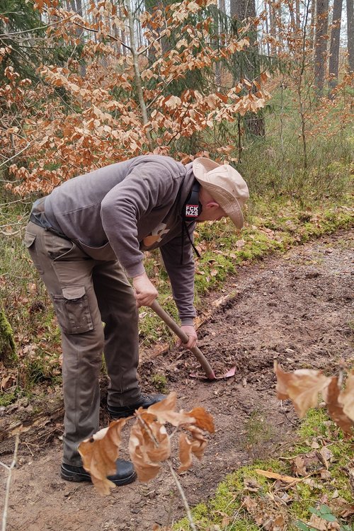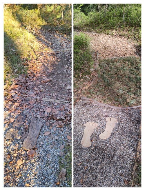 „Seitdem stehen jedes Frühjahr Instandhaltungsarbeiten an, die wir gerne übernehmen,“ kommentiert Co-Sprecher Hartmut Wauer. „Ein Dank gebührt auch dem Umweltamt der Marktgemeinde, mit dem wir dabei immer gut zusammenarbeiten.“ Denn der Markt stellt für den Pfad die Materialien wie Kies, Sand oder Hackschnitzel bereit. Die Grünen und ihre Helfer*innen investieren vor allem Zeit: Materialreste entfernen, Holzstämme zurechtsägen, Zapfen, Kiefernnadeln und Moos sammeln und die Felder wieder auffüllen. In diesem Jahr mussten auch die Fußabdrücke aus Holz erneuert werden, die den Einstieg in den Pfad markieren. Sie wurden von einem privaten Spender handgefertigt.