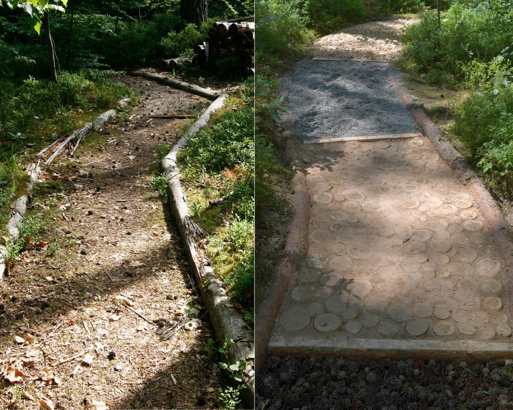 Die Grünen hatten sich für die Restaurierung bereits im Herbst mit dem Bau- und Umweltamt des Marktes Allersberg abgestimmt. Während der Markt einen Großteil der Materialien bereitgestellt hat, haben die Grünen vor allem viel Zeit investiert: An drei Tagen im Juni sind die Helfer zusammengekommen und haben – unter Einhaltung der geltenden Hygiene- und Abstandsregeln – die alten Begrenzungen und Materialreste entfernt, Holzstämme gesägt und verlegt und die Felder dann mit verschiedenen Materialien gefüllt. Einige Materialien, wie Kiefernzapfen, Kiefernnadeln und Moos, haben sie selbst im Wald gesammelt. Andere hat ein privater Spender zur Verfügung gestellt. Auch das handgefertigte Holzschild, das gut sichtbar auf den Pfad hinweist, ist eine Spende.