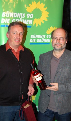 Der bayerische Landesvorsitzende der Grünen, Eike Hallitzky (re.). Mit Flüssigem bedankte sich Gemeinderat Mario Engelhardt (li.) bei dem Referenten.