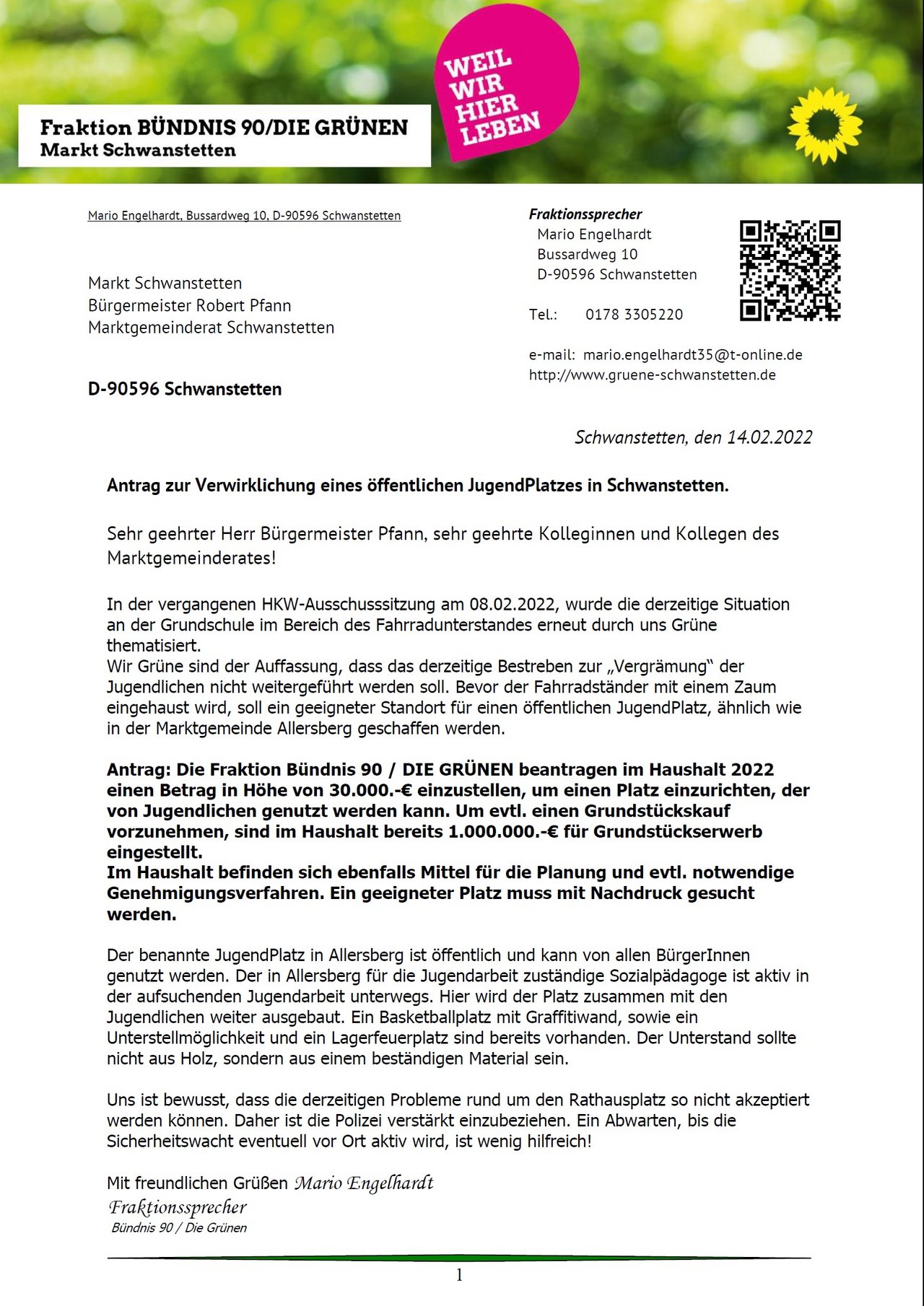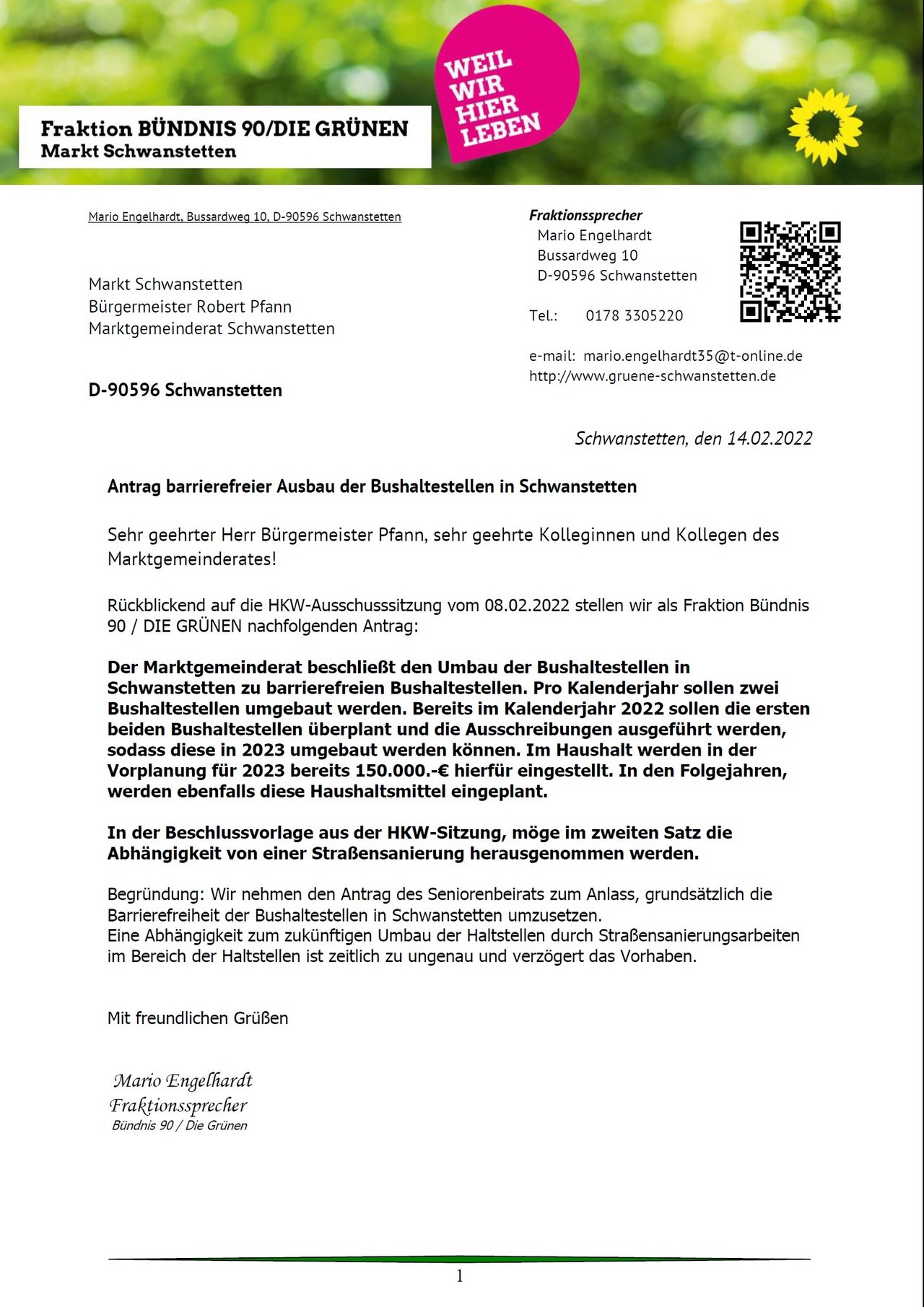 Mario Engelhardt, Sprecher der Grünen-Fraktion , sieht die sinkende Steuer- und Umlagenkraft als zentrale Herausforderung: „Schwanstetten liegt auf Platz 16 von 16 im Landkreis.“ Um das zu ändern, müsse die Gemeinde attraktiver für junge Familien werden: „Mit Oberlohe sind wir auf einem guten Weg, die Realisierung lässt jedoch auf sich warten. Hier der Appell an dieser Stelle an alle, die mit diesem Erschließungsgebiet noch ihre Probleme haben, doch bitte dem gefundenen fairen Kompromiss zuzustimmen.“ Die Grünen setzen auf eine Kombination aus Wachstum und strategischen Investitionen: „Die Sanierung der Gemeindehalle ist notwendig, ebenso die neue Feuerwehrzentrale – und das wie versprochen bis 2027/28.“